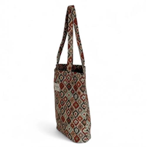 Bolsa "tote bag" con asas para llevar al hombro. Con tejido grueso de jacquard con estampado geométrico multicolor. Para su correcto mantenimiento se aconseja lavarlo en frío y no utilizar secadora.