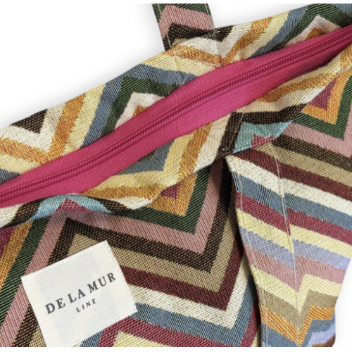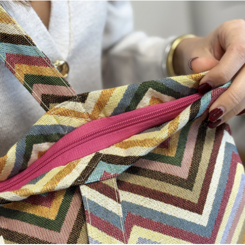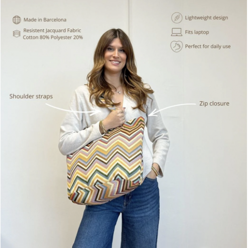 Bolsa shopper grande con asas para llevar al hombro. Con tejido grueso de jacquard 80% algodón y 20% poliéster con estampado tipo zigzag multicolor. Con cremallera en la parte superior. Para su correcto mantenimiento se aconseja lavarlo en frío a mano y no utilizar la secadora.