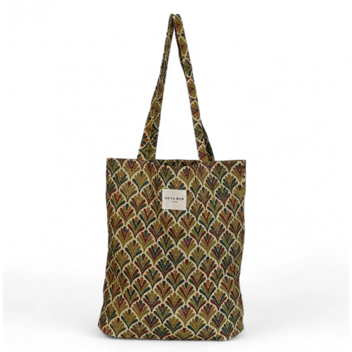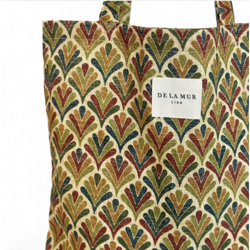 Bolsa “tote bag” con asas para llevar al hombro. Con tejido fino con estampado geométrico en tonos beige y verde. Para su correcto mantenimiento se aconseja lavarlo en frío y no utilizar secadora.