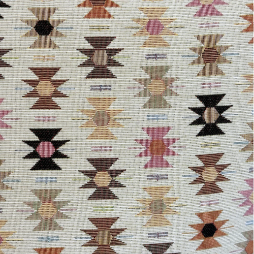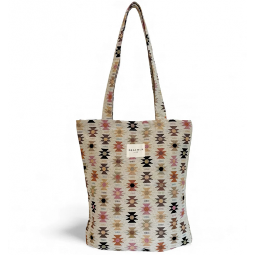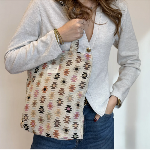 Bolsa "tote bag" con asas para llevar al hombro. Con tejido grueso de jacquard 80% algodón y 20% poliéster con estampado geométrico en tonos rosas y naranjas. Con cremallera en la parte superior.
