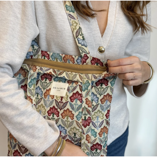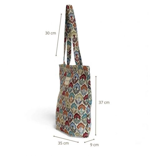 Bolsa "tote bag" con asas para llevar al hombro. Con tejido grueso de jacquard 80% algodón y 20% poliéster con estampado floral multicolor. Con cremallera en la parte superior.
