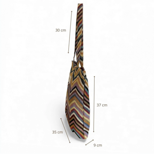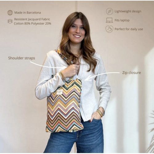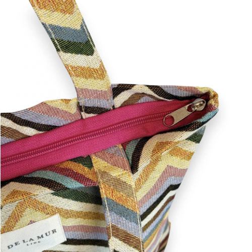 Bolsa "tote bag" con asas para llevar al hombro. Con tejido grueso de jacquard 80% algodón y 20% poliéster con estampado tipo zigzag multicolor. Con cremallera en la parte superior. Para su correcto mantenimiento se aconseja lavarlo en frío y no utilizar secadora.