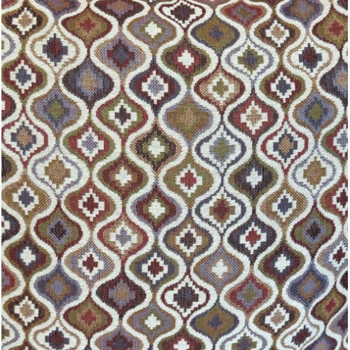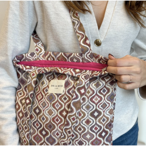 Bolsa "tote bag" con asas para llevar al hombro. Con tejido grueso de jacquard 80% algodón y 20% poliéster con estampado geométrico en tonos rosados y lilas. Con cremallera en la parte superior. Para su correcto mantenimiento se aconseja lavarlo en frío y no utilizar secadora.