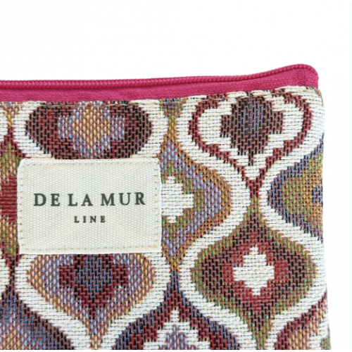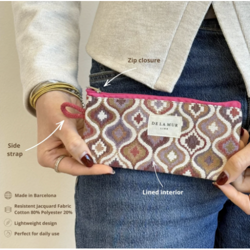 Funda de gafas con cremallera en la parte superior y pequeña asa de cordón de color rosa en el lateral. Tejido grueso de jacquard 80% algodón y 20% poliéster con estampado geométrico en tonos rosas y lilas.