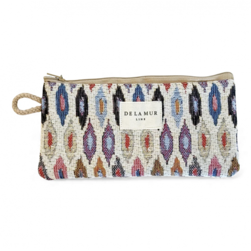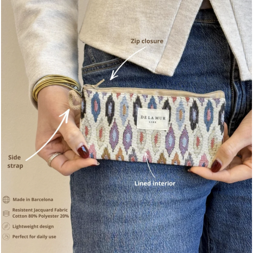 Funda de gafas con cremallera en la parte superior y pequeña asa de cordón de color gris oscuro en el lateral. Con tejido fino con estampado de espiga en tonos gris oscuro. Cada articulo puede tener una variación en el estampado, dependiendo de donde se haya efectuado el corte de la pieza. Forrado de tejido grueso de color gris en la parte interior.