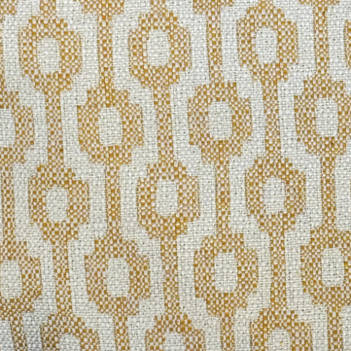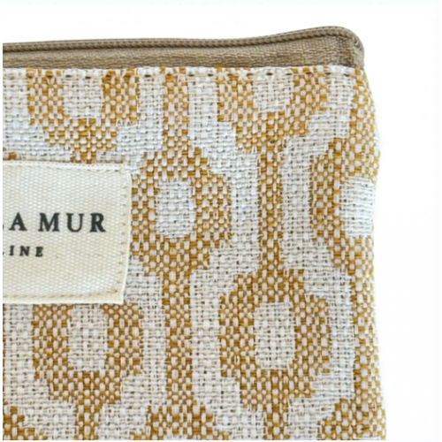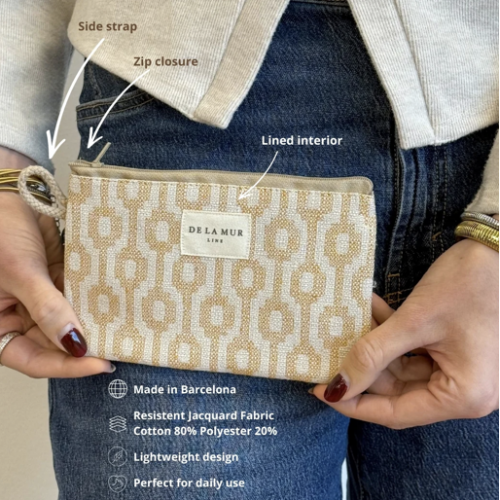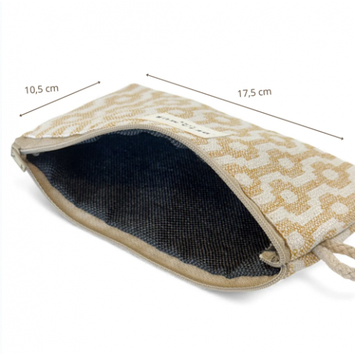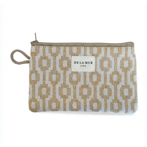 Monedero con cremallera en la parte superior y pequeña asa de cordón de color beige en el lateral. Tejido grueso de jacquard 80% algodón y 20% poliéster con estampado geométrico en tono beige y mostaza. Cada articulo puede tener una variación en el estampado, dependiendo de donde se haya efectuado el corte de la pieza.