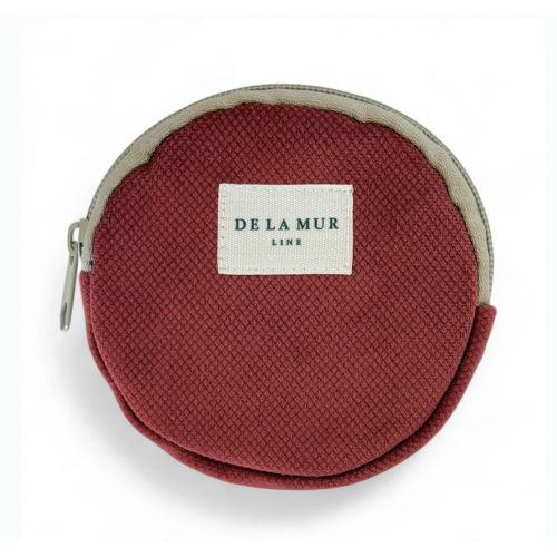 Monedero redondo con cremallera en la parte superior y pequeña asa de cordón de color beige en el lateral. Con tejido grueso de terciopelo granate. Cada articulo puede tener una variación en el estampado, dependiendo de donde se haya efectuado el corte de la pieza. Forrado de tejido grueso de color gris en la parte interior.