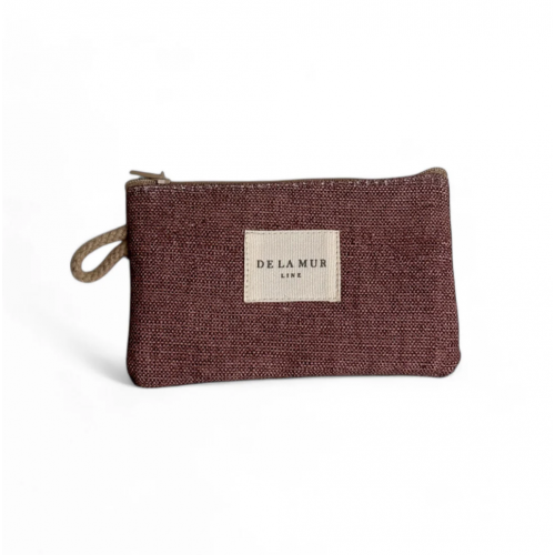 Monedero con cremallera en la parte superior y pequeña asa de cordón de color beige en el lateral. Tejido fino liso de color vino. Cada articulo puede tener una variación en el estampado, dependiendo de donde se haya efectuado el corte de la pieza. Forrado de tejido grueso de color gris en la parte interior.