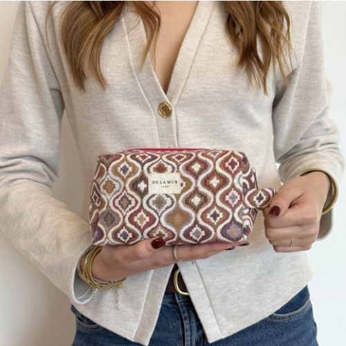 Monedero redondo con cremallera en la parte superior. Con tejido grueso de jacquard 80% algodón y 20% poliéster con estampado geométrico en tonos rosas y lilas. Cada articulo puede tener una variación en el estampado, dependiendo de donde se haya efectuado el corte de la pieza. Forrado de tejido grueso de color gris en la parte interior. Para su correcto mantenimiento se aconseja lavarlo en frío y no utilizar secadora.