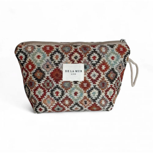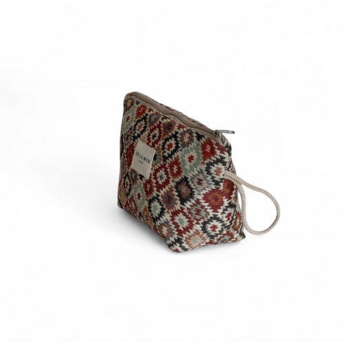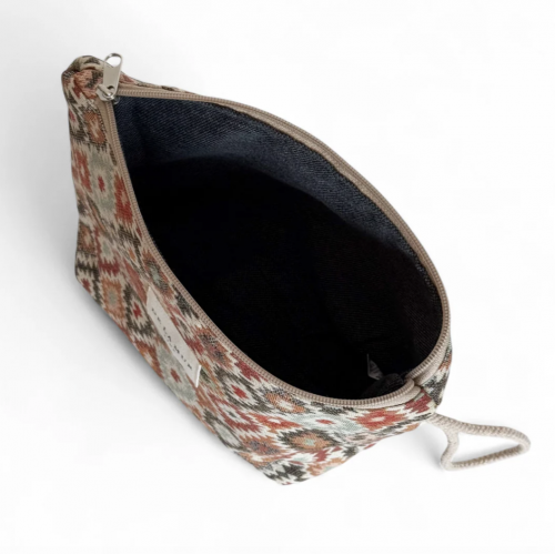 Neceser con cremallera en la parte superior y asa de cordón de color beige en el lateral. Confeccionado a mano con tejido grueso de jacquard con estampado geométrico multicolor. Forrado de tejido grueso de color gris en la parte interior.