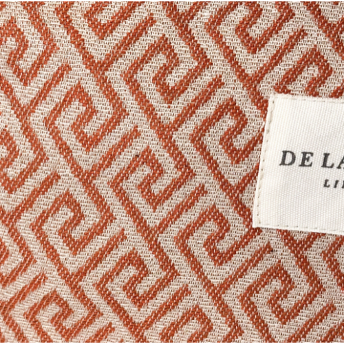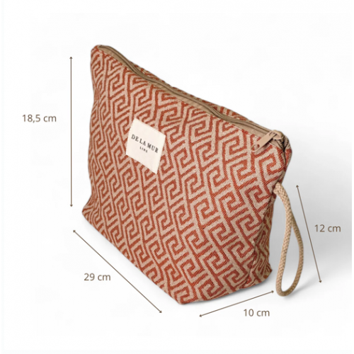 Neceser con cremallera en la parte superior y asa de cordón de color beige en el lateral. Tejido grueso de jacquard con estampado geométrico en tono teja.