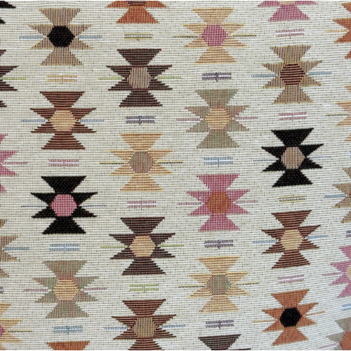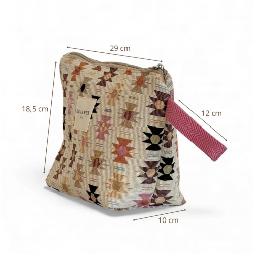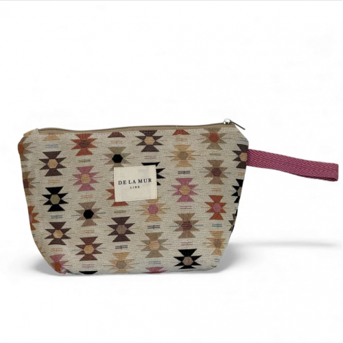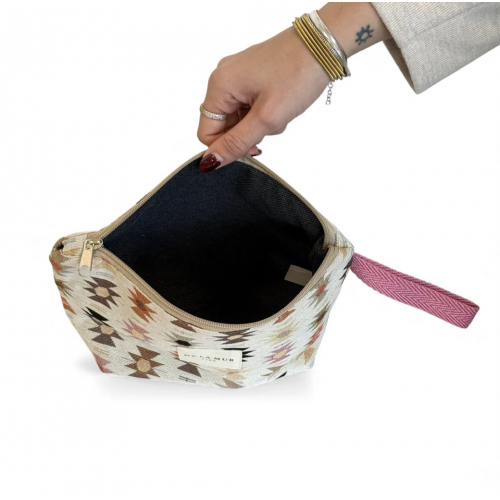 Neceser con cremallera en la parte superior y asa de cordón de color rosa en el lateral. Con tejido grueso de jacquard 80% algodón y 20% poliéster con estampado geométrico en tonos rosa y naranja sobre fondo beige. Forrado de tejido grueso de color gris en la parte interior.