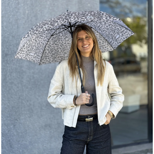 Paraguas largo con tejido de poliéster tipo pongee de secado rápido con estampado floral de leopardo. Puño de plástico y varillas fibra anti-viento. Sistema de apertura automático.