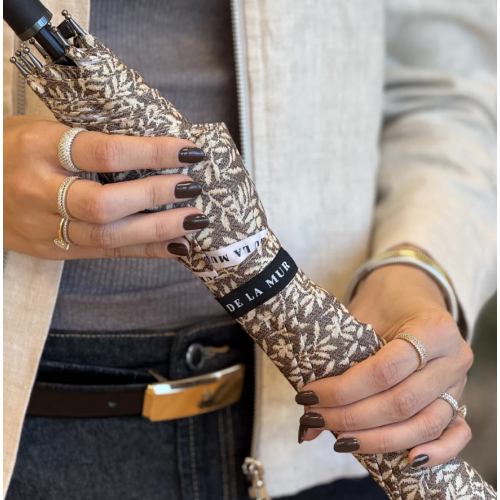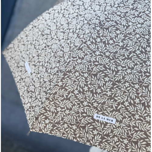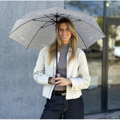 Paraguas largo con tejido de poliéster tipo pongee de secado rápido con estampado floral de color crudo sobre fondo color topo. Puño de plástico y varillas fibra anti-viento. Sistema de apertura automático.